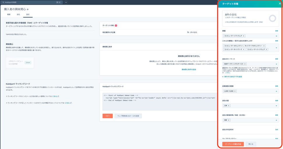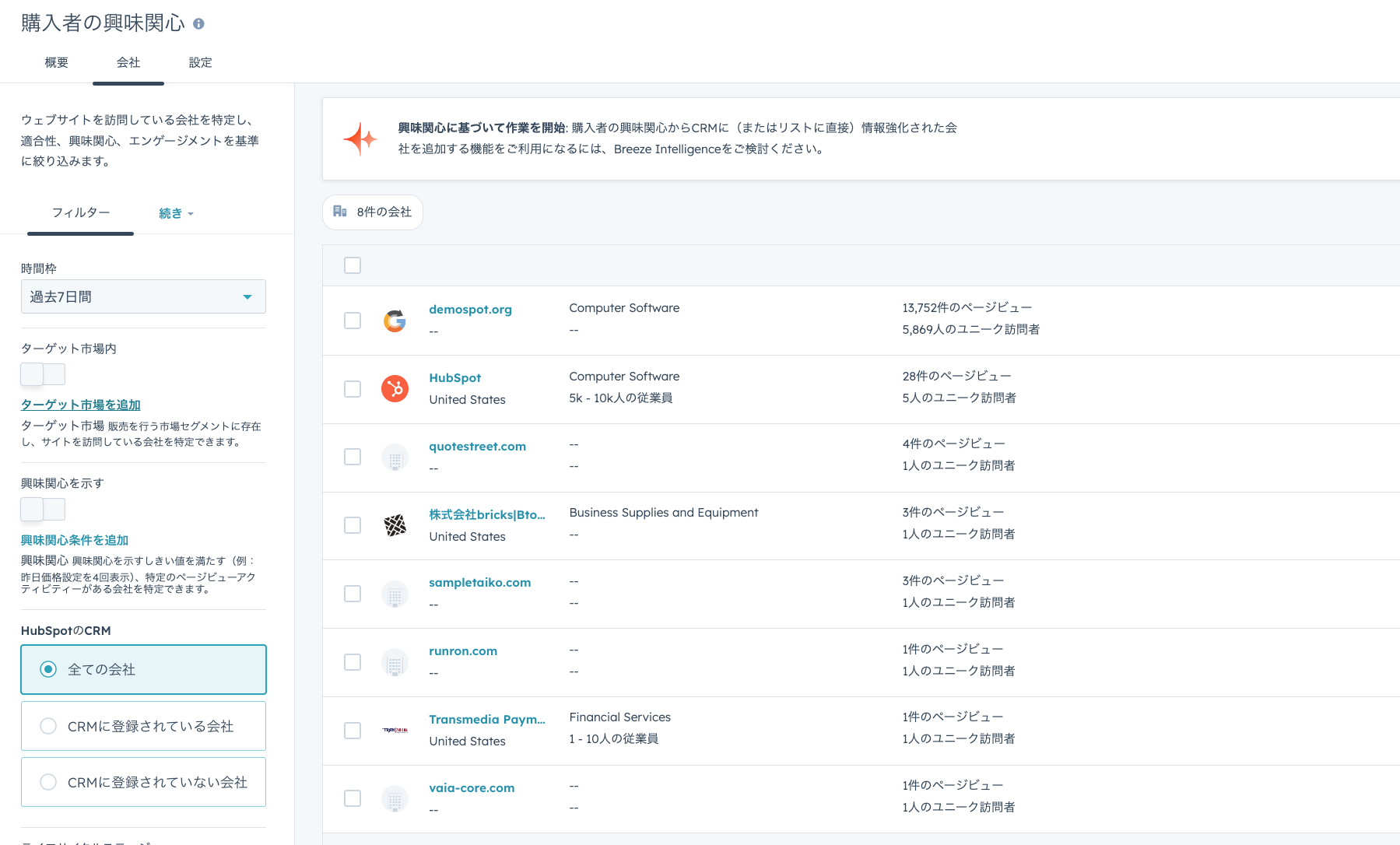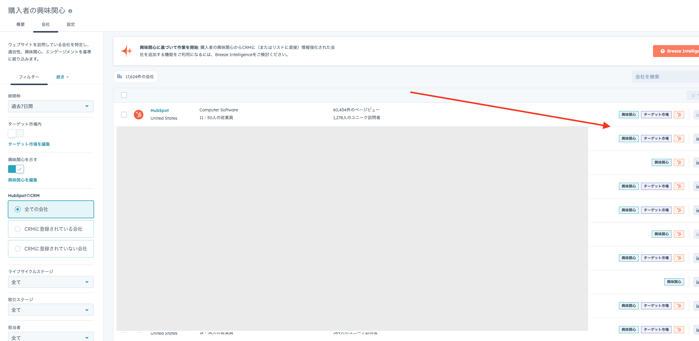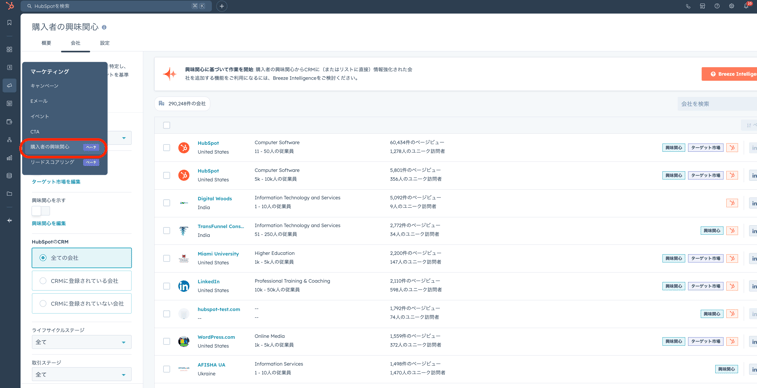 ②HubSpotのマーティング>購入者の興味関心からどのような企業が自社サイトにアクセスしてるか確認。ここ見るだけでも意外な企業がもしかしたらアクセスしてるかも・・?