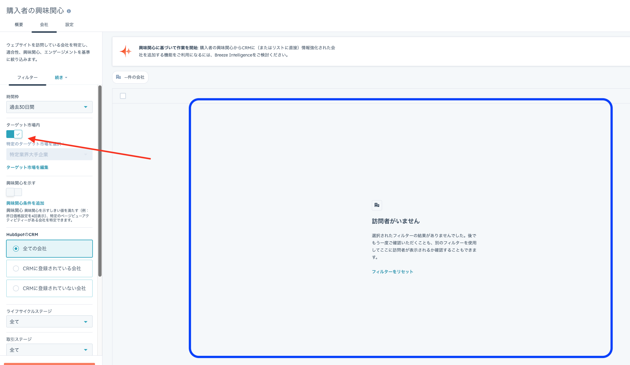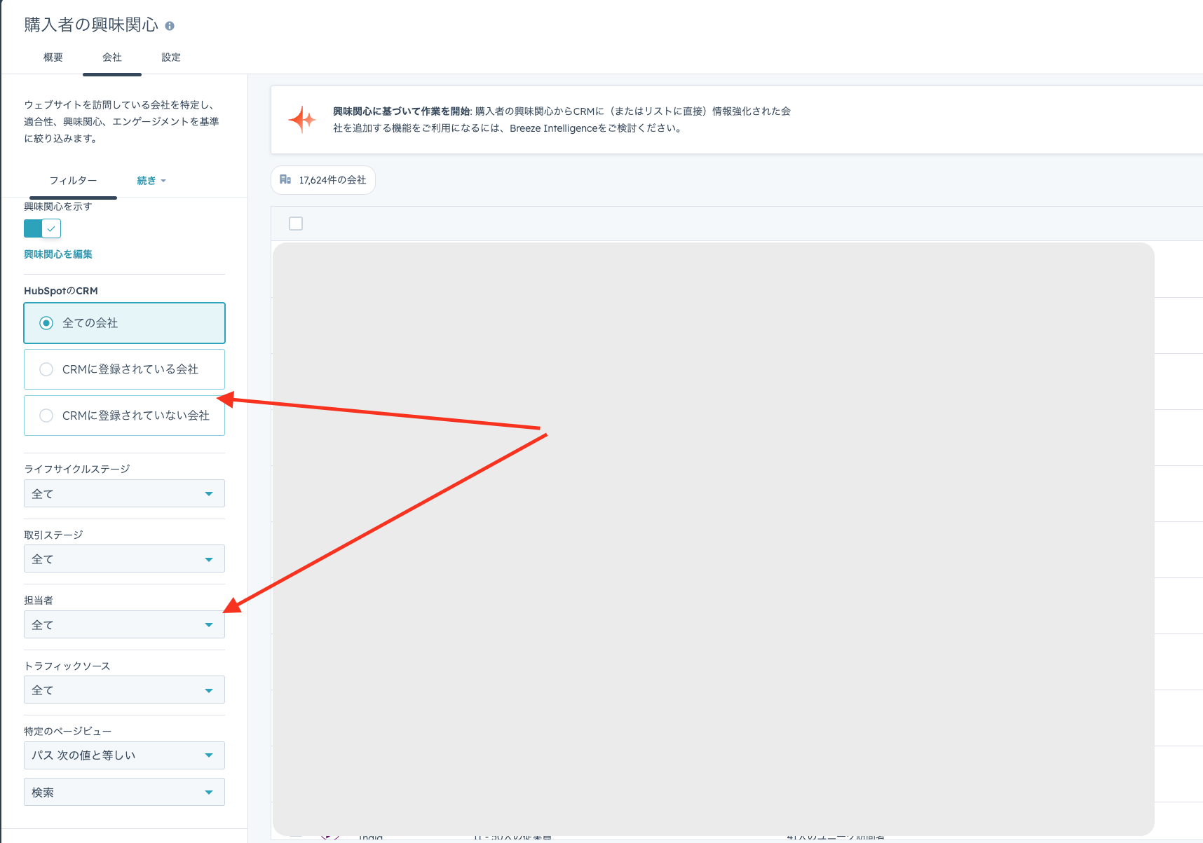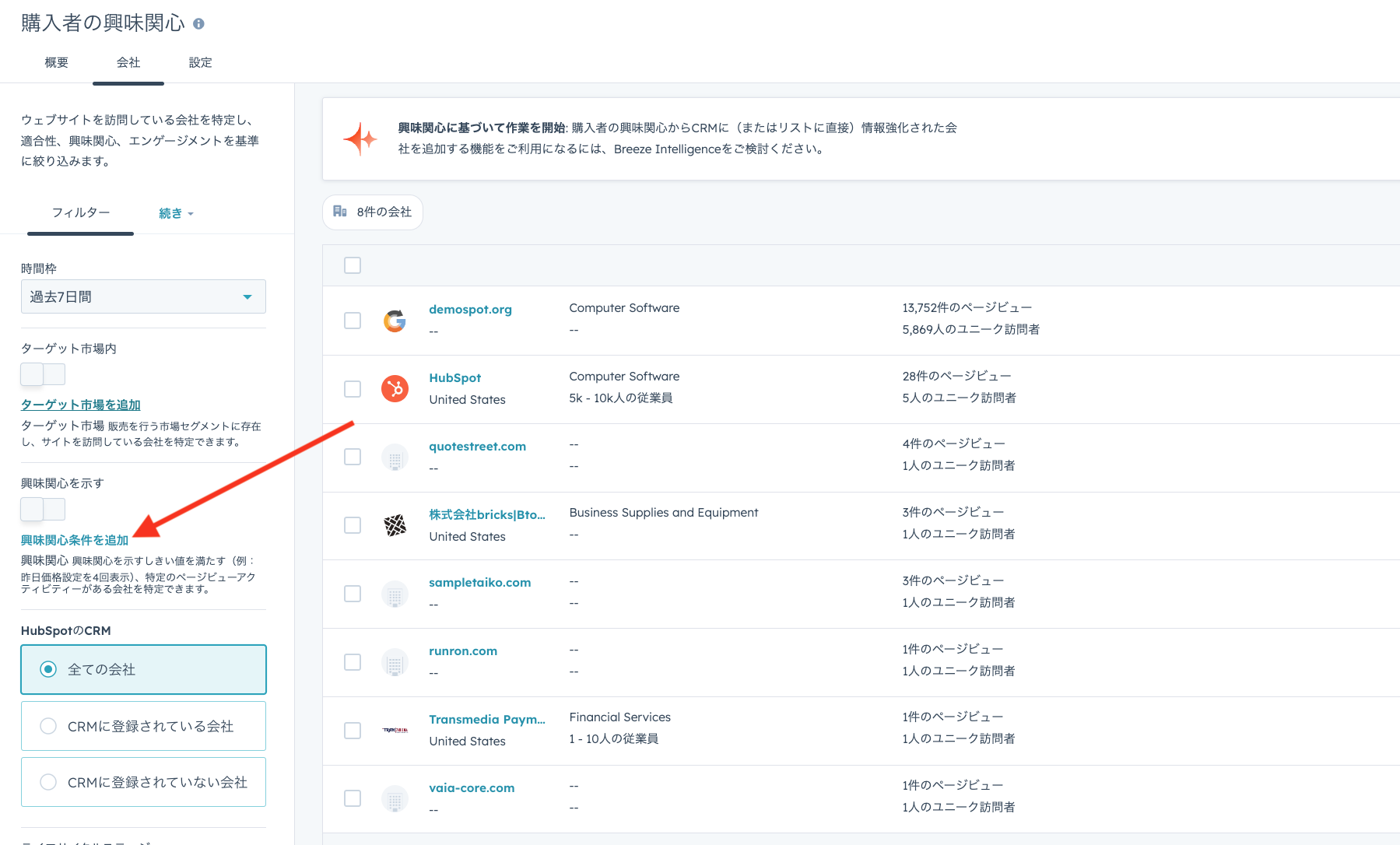 ②HubSpotのマーティング>購入者の興味関心からどのような企業が自社サイトにアクセスしてるか確認。ここ見るだけでも意外な企業がもしかしたらアクセスしてるかも・・?